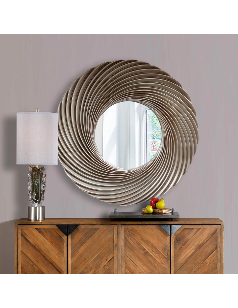Espejo Moderno y Contemporánea, y muy atrevido en su geometría, con un acabado plata patina que resalta su belleza. Decora tu sala, recamara, comedor, simplemente lo puedes colocar en donde quieras.